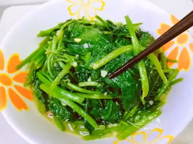 所需食材:地瓜葉,蒜末,黃豆醬,食用油,清水(地瓜葉一般是吃葉子和嫩莖部位,這個部位也叫「紅薯尖」)