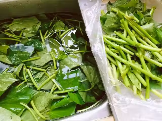 第二步:將地瓜葉和嫩莖都擇洗乾淨,分開放到兩個盤裡邊。