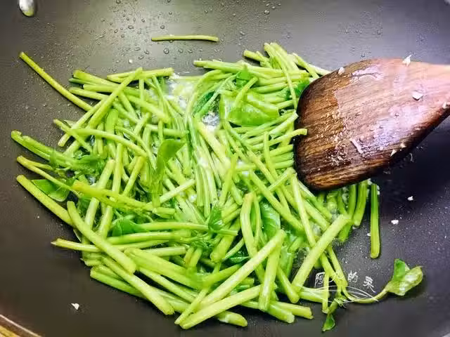 第六步:加入地瓜葉,快速翻炒半分鐘,至葉片均勻變軟。