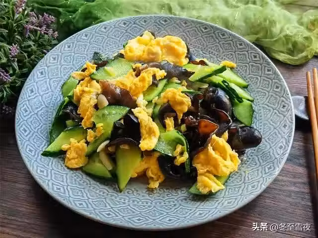 【黃瓜木耳炒雞蛋】所需材料:木耳1把、黃瓜1根、雞蛋3個、油鹽適量、蔥1段、大蒜2瓣、雞精1茶匙、