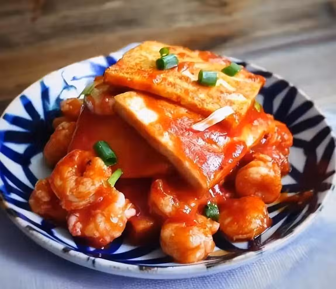 食材:蝦仁150克;豆腐500克;香蔥3棵;番茄醬;白砂糖;鹽;澱粉