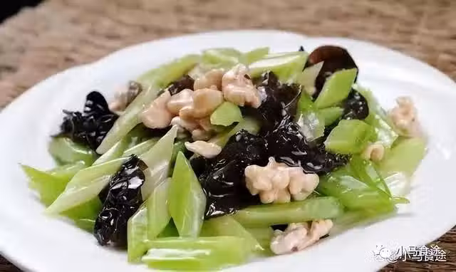 1.新鮮去皮核桃仁,下入開水鍋中微微汆燙一下,迅速撈出沖涼備用。切成斜段的西芹和泡發好的木耳一同下入開水鍋中汆一下出鍋,保留西芹的脆爽,沖涼備用。