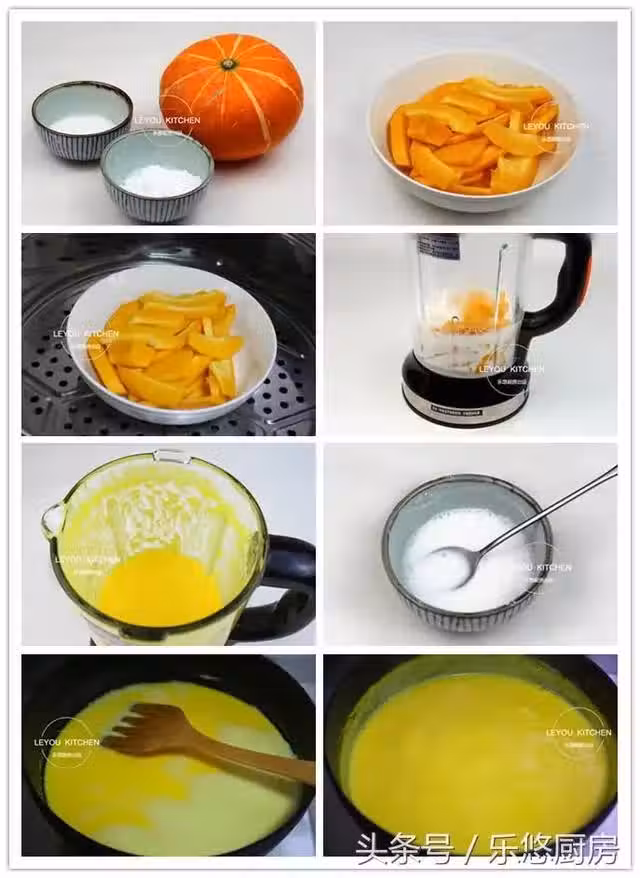 第八步:緩緩的將糯米水倒入鍋中,邊倒邊攪拌,至直攪拌均勻,沒有顆粒。最後,整鍋南瓜糊煮開即可關火。(放一些糯米粉,可以讓南瓜羹更加粘稠,喝起來口感也更好。)