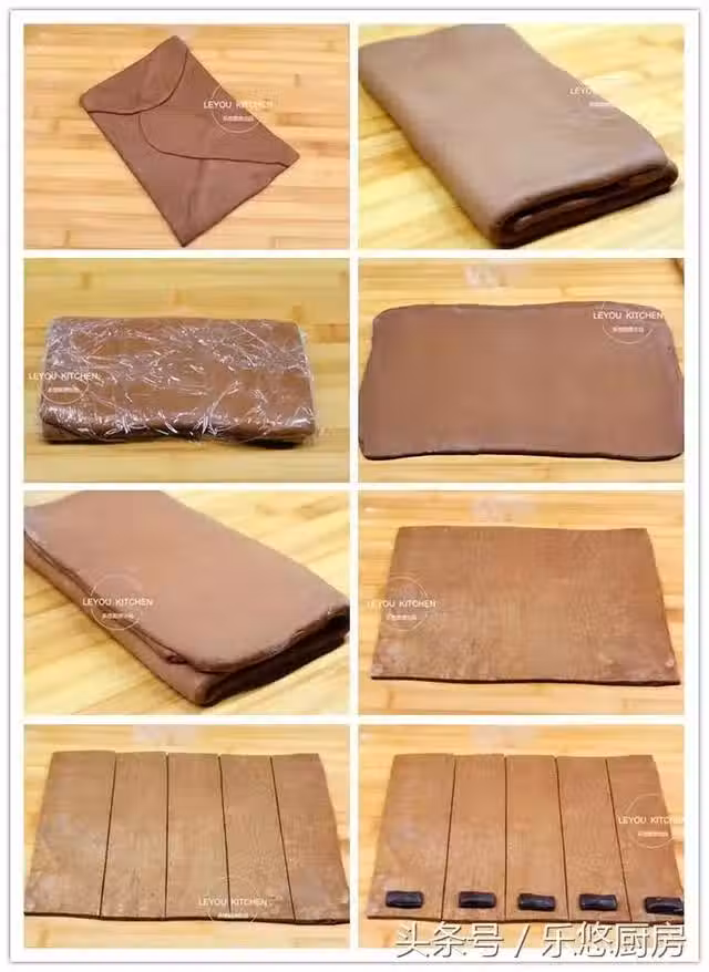 第十三步:再次像疊被子一樣疊成三層,如圖。然後包好保鮮膜,放到冰箱冷藏20分鐘。冷藏結束後,拿出再次擀開,疊成三層,最後包好保鮮膜,放到冰箱冷藏20分鐘。(前後要疊三次。)