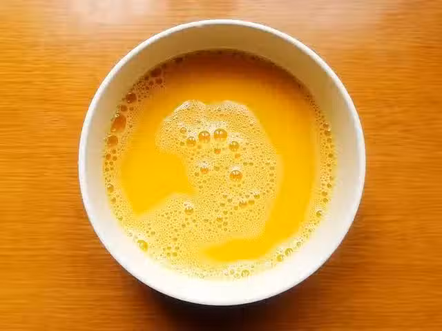 5、鍋內倒入適量的食用油,油溫燒熱後,轉小火,把蛋液倒入鍋中,蛋液剛下鍋的時候,不要急著翻動它