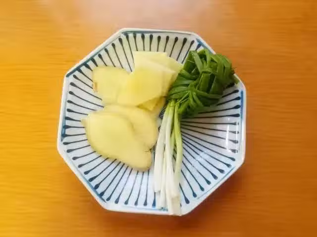 5、將泡好的雞翅雞爪冷水下鍋,再加入香蔥、3勺料酒和一半的薑片,大火煮沸後轉中火焯燙2分鐘