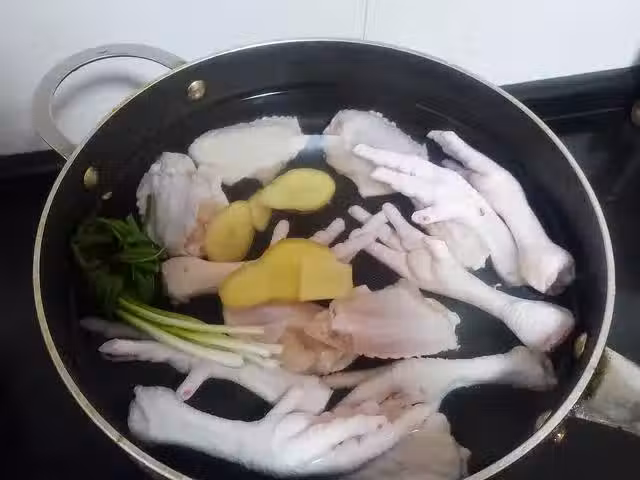 6、焯燙好的雞爪雞翅撈出,用水多次沖洗幾遍,然後瀝干水待用
