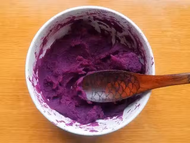 11、等紫薯壓好後,我們倒入110克的木薯粉,攪拌成麵粉顆粒狀,如下圖所示