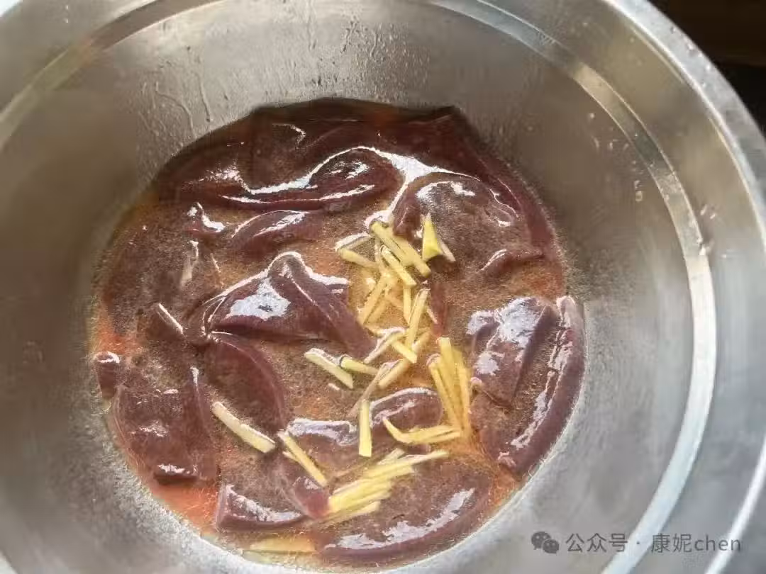 第六步:豬肝洗凈後,用鹽、胡椒粉、米酒、油和玉米澱粉拌勻,豬肝腌製片刻。