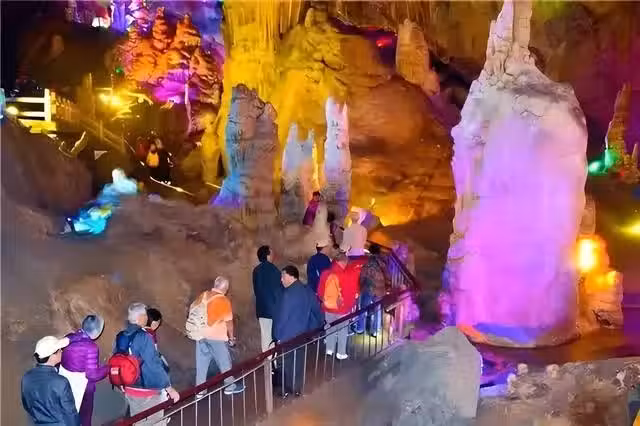 芙蓉洞,位於重慶市武隆區,是一個大型石灰岩洞穴,發育在古老的寒武系白雲質灰岩中,以其色彩斑斕的鐘乳石和地下河流而聞名。整個芙蓉洞的最大靜態和客容量為185000人。同時被譽為「世界三大洞穴」之一。