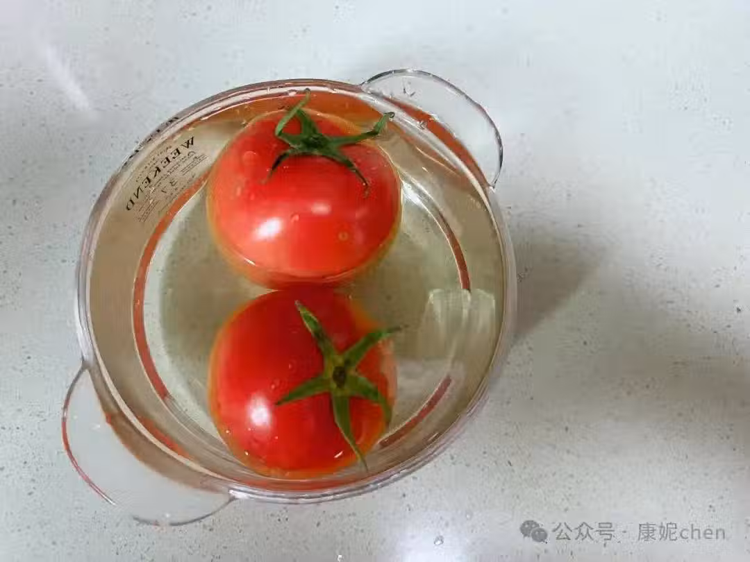 第二步:西紅柿用沸水燙一下,西紅柿剝皮後切成小塊。