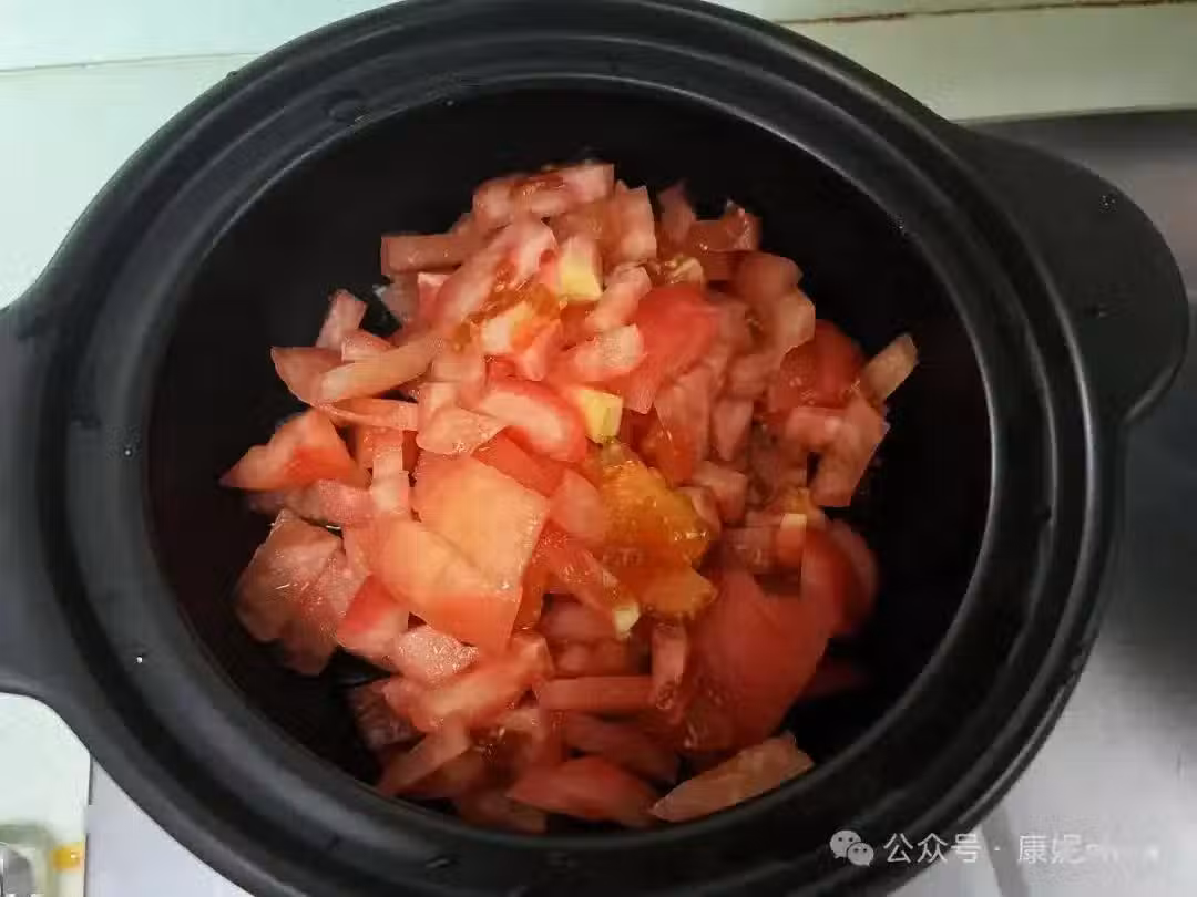 第三步:砂鍋放入蒜蓉,放入西紅柿,將西紅柿翻炒一下。如果要味道更香濃,可以將砂鍋擦乾水分,燒熱油爆香蒜蓉,再加入西紅柿。那為什麼我不放油做這道湯菜呢?因為春天了,我要控制體重,等到夏天可以穿美美的裙子。