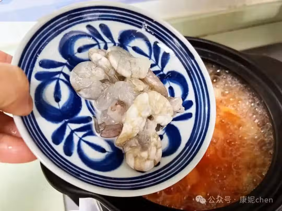 第七步:加入腌制好的蝦仁,用大火煮,蝦仁轉色就煮熟了。