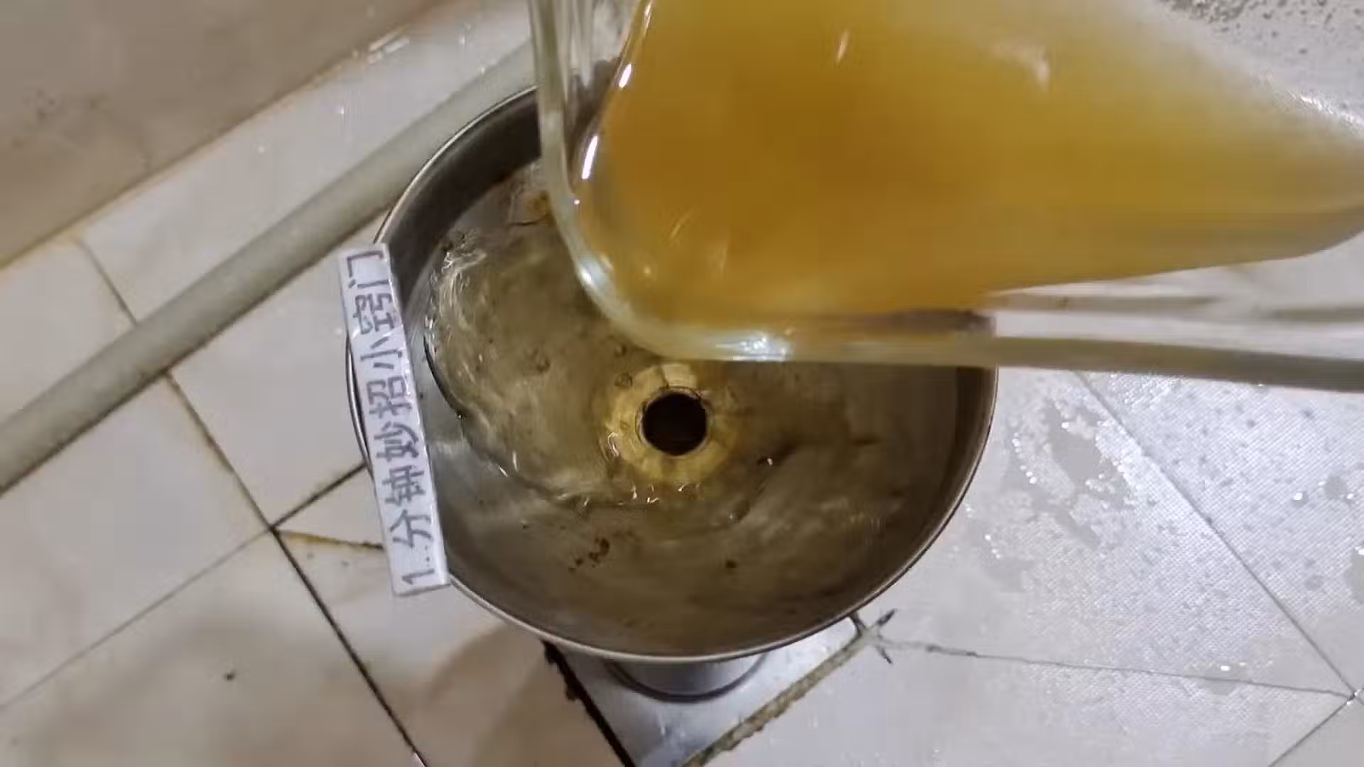 8.現在,我們打開地漏的蓋子,我們把啤酒瓶倒過來,插進管道口,這樣裡面的溶液就會一衝到底,全部都衝到下水道裡面,我們就可以用這款溶液來清潔管道裡面的污漬和異味,全部倒完了之後,我們不要把啤酒瓶直接拿出來,讓它放置一會,堵住這個地漏口,這樣即使裡面的有一些小飛蟲想跑出來,也跑不掉。