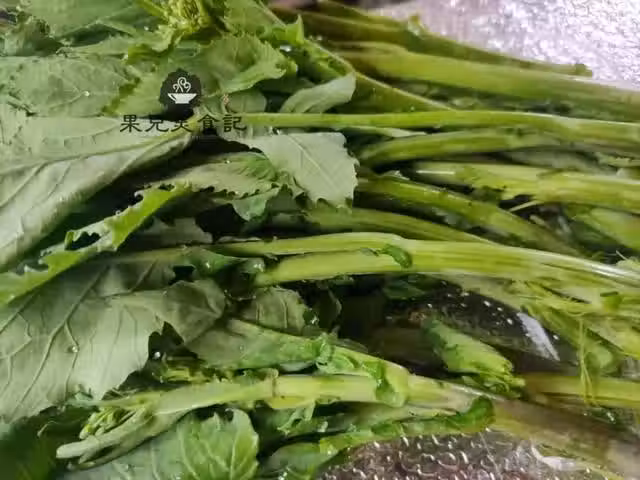 五、菜苔撕去外皮,摘成小段,加鹽浸泡一下,清洗乾淨,瀝干水分;