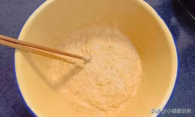 【步驟四】:蓋上蓋子,放溫暖處發酵至2倍大,發酵好后里面有很多氣泡,扒開成拉絲狀態,然後用筷子攪拌,把裡邊的氣排掉。