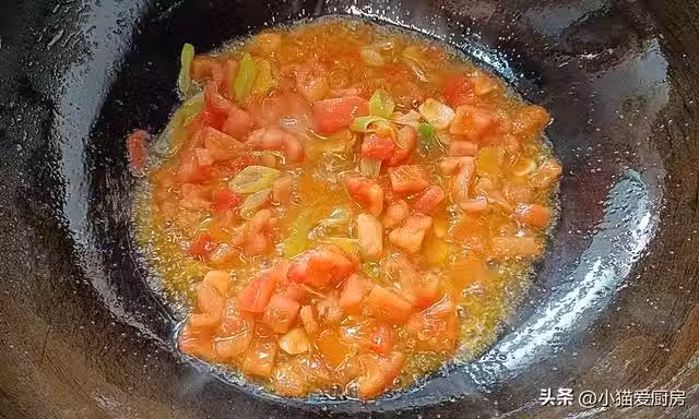 【步驟七】:西紅柿炒出汁水,放入豆腐和木耳,同時放入鹽1勺、松茸鮮1勺、生抽2勺。