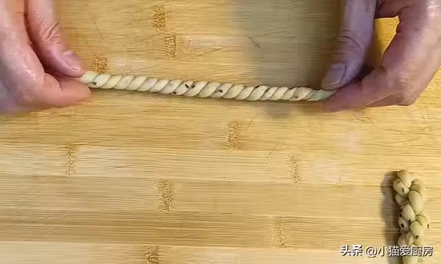 【步驟七】:把搓上勁的麵條,再次對摺,麵條會繼續自然纏在一起,然後把一頭穿入另外一頭帶控的一端,就成麻花了。
