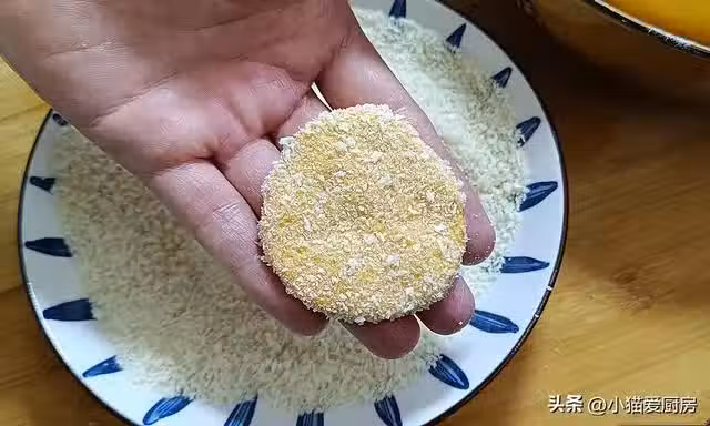 【步驟七】:鍋中放油燒熱至六成熱,也就是筷子放裡邊周圍起泡泡就可以,把裹上麵包糠的南瓜餅逐一下入鍋中。