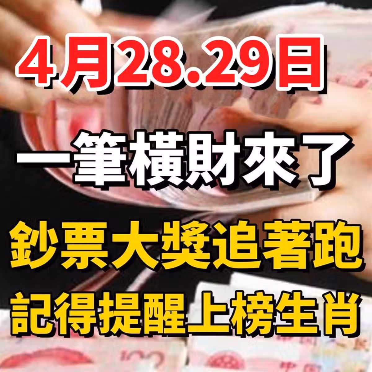 4月28.29日:一筆橫財來了,鈔票大獎追著跑!記得提醒上榜生肖!