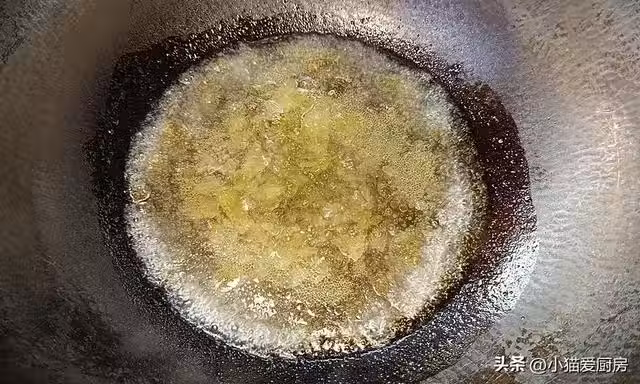 【步驟三】:當糖水不停的翻泡沫,由小泡泡變成密集的大泡泡,證明水分已經蒸發完了,就已經變成糖漿了,這個時候放入一勺植物油,同時開小火熬制。