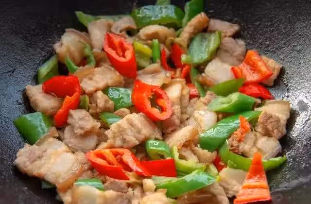 第六步、翻炒半分鐘,肉片入味後加入適量雞精、白糖提鮮,出鍋前淋入適量香油,翻炒均勻後即可出鍋。