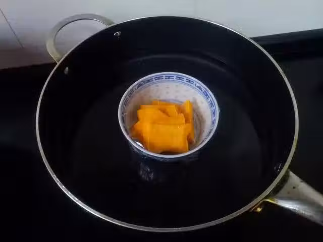 2、南瓜蒸熟後倒入大碗內,用勺子將它壓成泥狀。