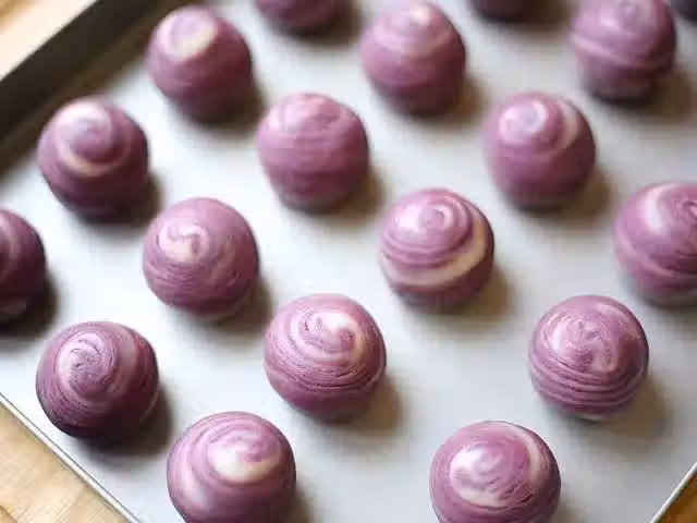 20、最後送入預熱好的烤箱中層,上下火170度,烤26分鐘即可。烤到15分鐘的時候,記得加蓋錫紙,這樣可以避免烤出來的紫薯酥,有表皮發黃的情況。