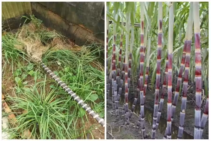 網友在網路分享在地上看到一根黑白相間的細長物體,戲稱是一根甘蔗。左圖取自臉書,右圖本報資料照