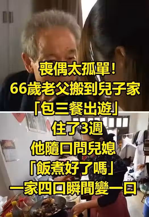喪偶太孤單!66歲老父搬到兒子家「包三餐出遊」住了3週 他隨口問兒媳「飯煮好了嗎」一家四口瞬間變一口~