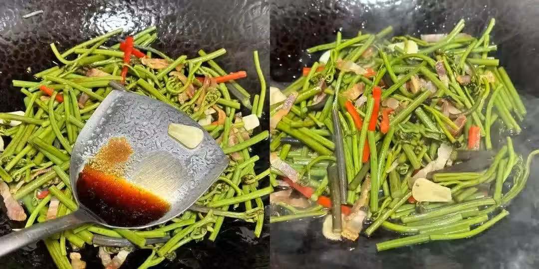 4、加入臘肉炒的蕨菜真的非常香!蕨菜是這個季節的野菜,營養豐富,看見它就一定要買點回來吃吃,因為錯過就要等到下一個春天了!