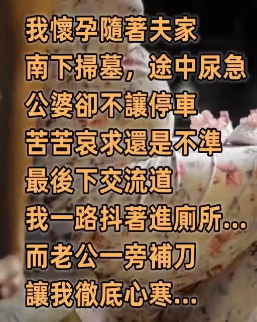 我懷孕隨著夫家南下掃墓,途中尿急公婆卻不讓停車,苦苦哀求還是不準,最後下交流道,我一路抖著進廁所…而老公一旁補刀讓我徹底心寒~