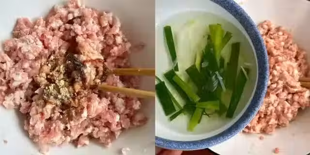 2、把水分都吃進去以後,攪打至上勁,加入玉米澱粉,再次攪拌至上勁;我們肉餡兒基本就調好了!