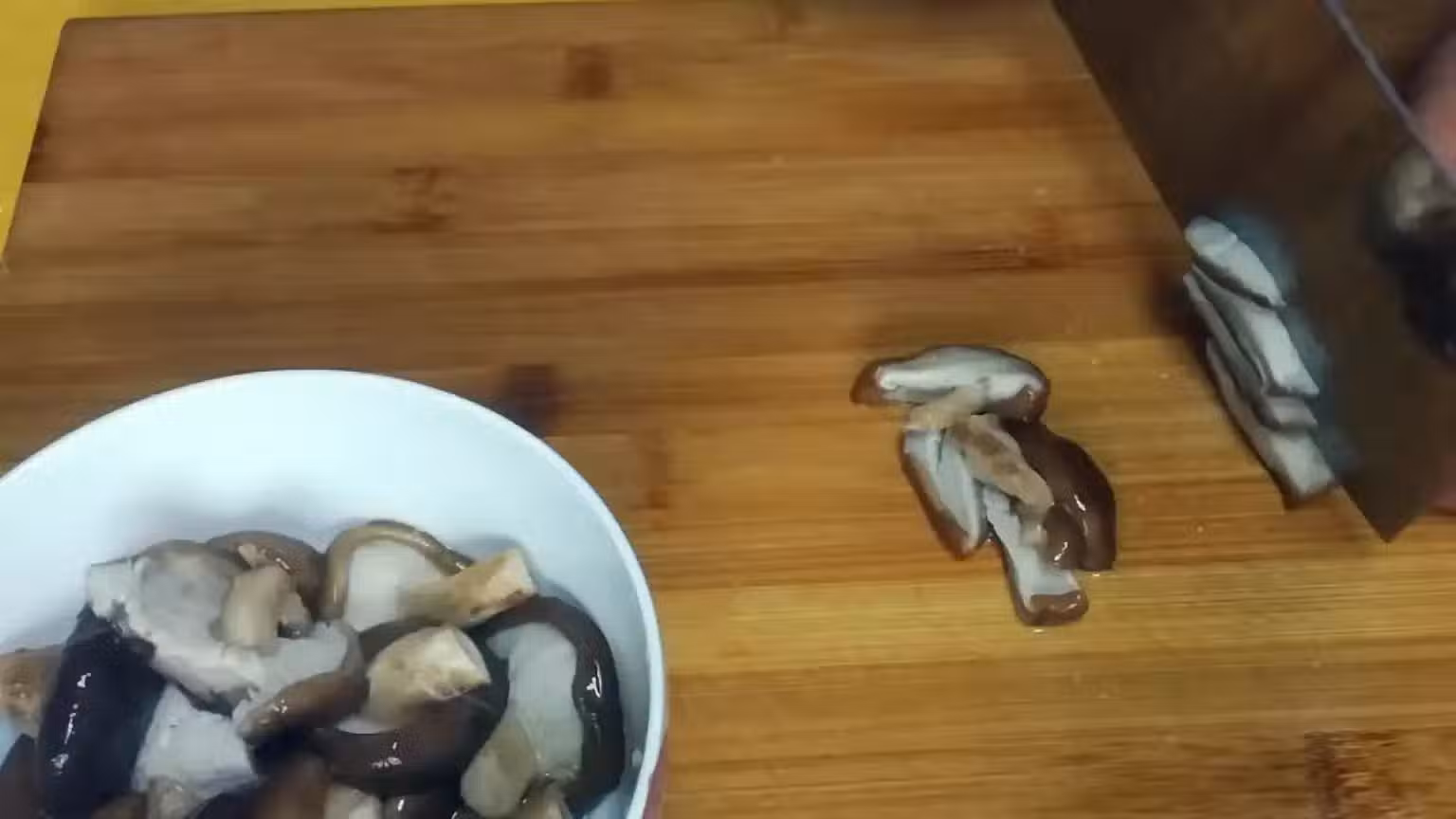2、把香菇切成均勻小塊,這樣更容易入味,口感也會更好;切好後放入碗中,再用清水清洗2遍,洗凈控水備用。