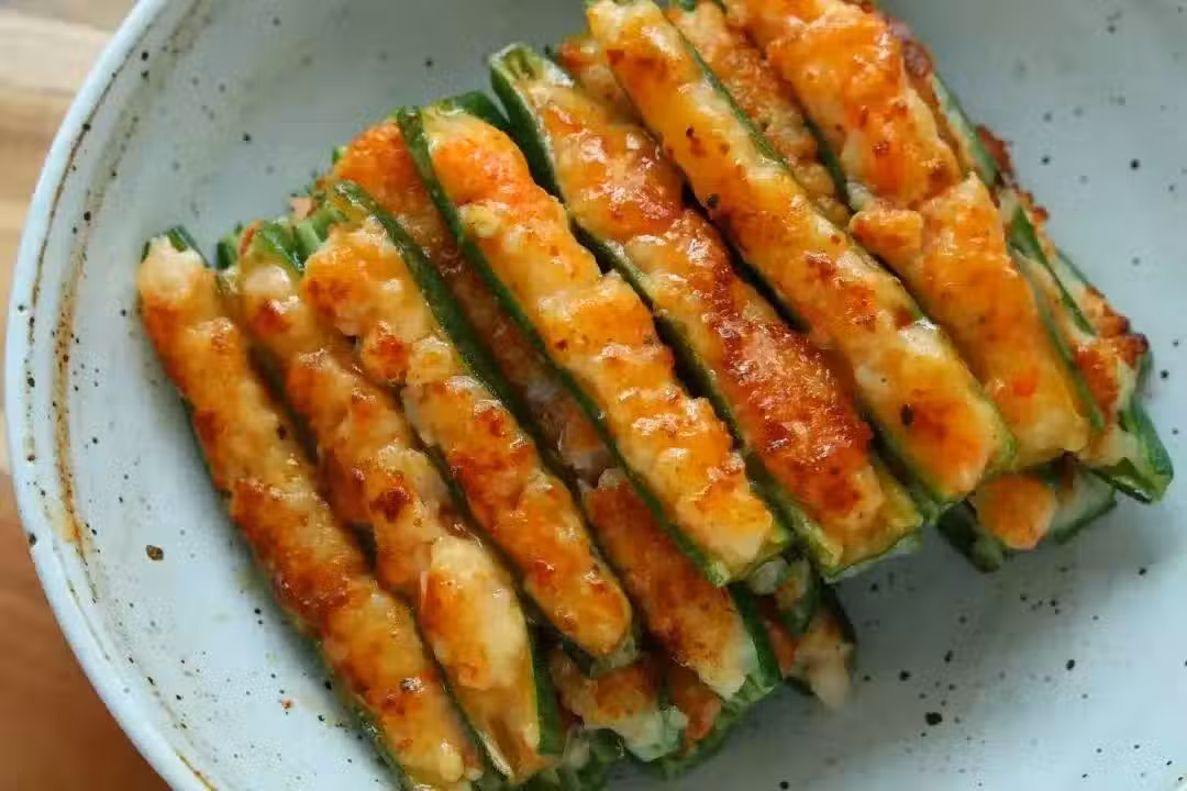 終於,當底部煎至金黃色的那一刻,蝦仁釀秋葵終於完成了它的蛻變。那金黃色的外皮酥脆可口,而裡面的蝦仁與秋葵則是鮮嫩滑爽,口感豐富。每一口都充滿了海洋的鮮香與秋葵的清新,讓人陶醉其中。