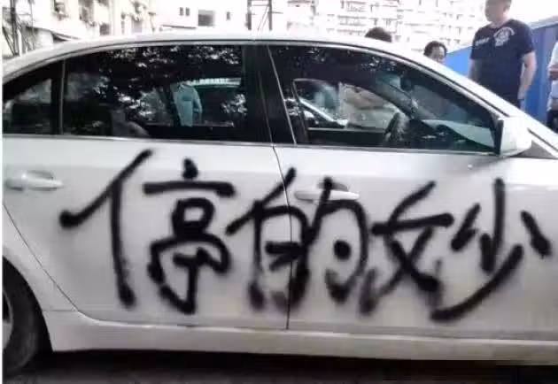 店家在連續撥打了很多次電話後依舊未接通的情況下,脾氣也是上來了,用釘子和錘子對女車主的車子好好進行了改造一番。