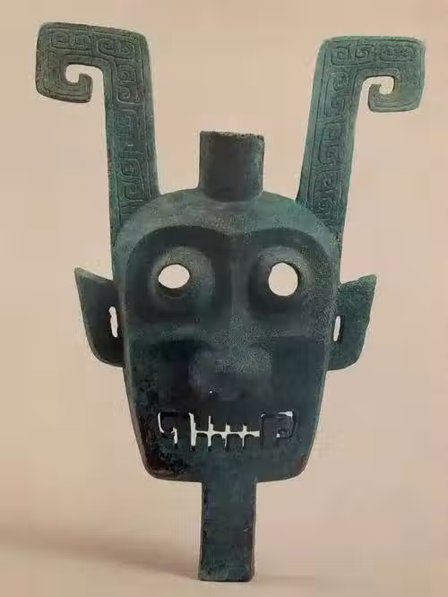 這件器物的青銅人面巨目外凸,大鼻有雙孔,口闊露齒,兩耳尖長,似乎頗有幾分四川三星堆青銅人面具的意思?