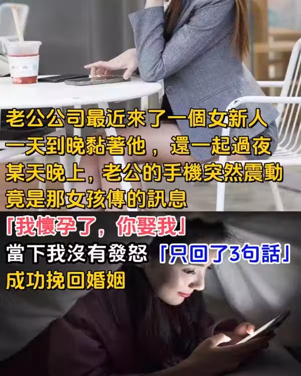 老公公司最近來了一個女新人,一天到晚黏著他,還一起過夜⋯某天晚上,老公的手機突然震動,竟是那女孩傳的訊息:「我懷孕了,你娶我」。當下我沒有發怒「只回了3句話」,成功挽回婚姻~