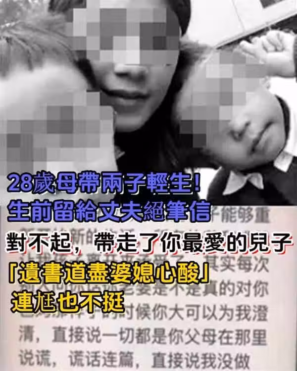 28歲母帶兩子輕生!生前留給丈夫絕筆信:「對不起,帶走了你最愛的兒子…」 「遺書道盡婆媳心酸」連尪也不挺!