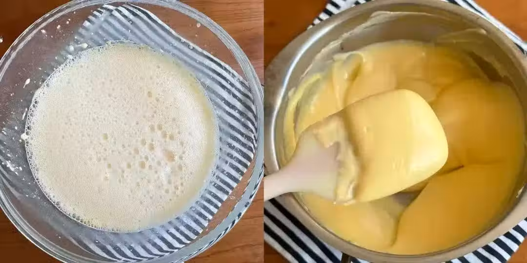 3、稍微放涼之後,過篩放在碗中,貼包保鮮膜冷藏放涼備用。