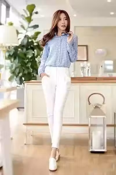 淺藍色襯衫採用經典的格子設計,藍白色的搭配清爽怡人,款式簡約合身,極具知性氣質,搭配白色緊身褲清新利落,打造唯美的韓式風格。