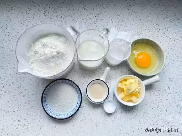2、把所用的食材,除黃油以外全部放入廚師機桶里,先放液體後放固體,麵粉和酵母在最上面。