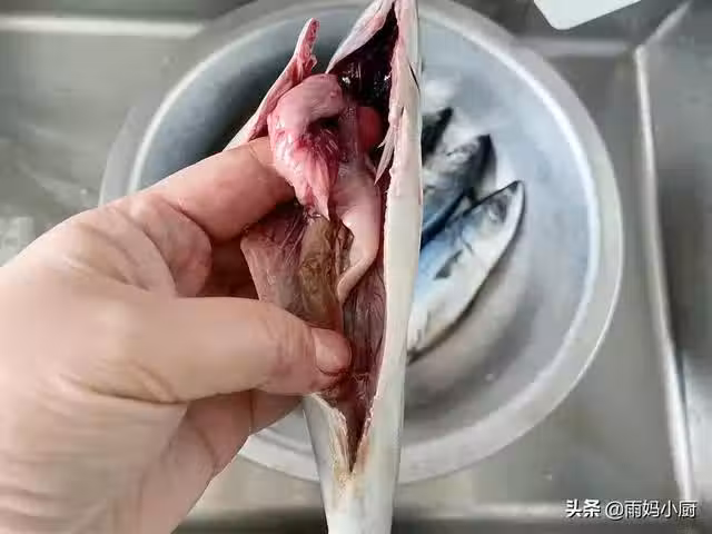 3、把魚中間的魚骨,直接輕輕地拉出來,把魚骨折斷去掉,把魚洗乾淨瀝干水分。