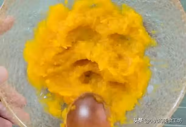 準備一塊紅薯(250g),洗凈之後削去外皮,用刀切成小塊,然後上鍋蒸15分鐘左右,蒸熟之後出鍋晾涼備用。紅薯晾涼之後,倒入20g白糖,用勺子將紅薯碾成紅薯泥備用;