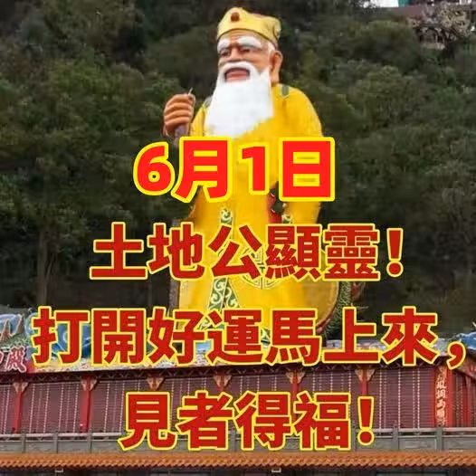 6月第一天,土地公顯靈!打開好運馬上來,見者得福!下半年身體安康發大財!真的靈!土地公會留在人間三天,這三天大家別忘了接土地公,我接了;土地公說了:按贊【好運到】留言【一路發】轉走【中大獎】下半年年就有求必應:誰將我轉走,我就讓他一路發發發;