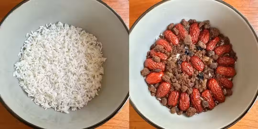 3、然後再鋪上一層糯米,撒上紅糖。加入與食材齊平的清水。