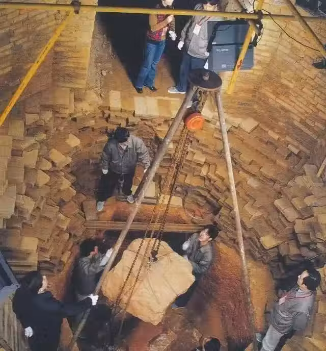 這塊頂石並不算巨大,但其重量卻達到了750公斤左右,如此重量定然不是人能夠搬動的,於是他們架起了能夠稱重三噸的滑輪組,對其進行搬運,並在巨石剛被搬開之時,就在下面墊上了不少的鋼管,防止滑輪組出現故障。