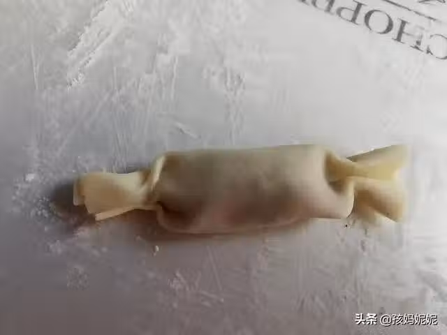 4、從一邊慢慢捲起,兩端輕輕擰一下,把香蕉餡包裹起來,就像包裹糖果那樣,在包裹的時候邊上也要蘸上一點水,這樣就能夠讓皮很好地粘住了。擰的時候動作要輕一些,因為餛飩皮也都是非常的薄的,如果用力的話很有可能就會擰破了。