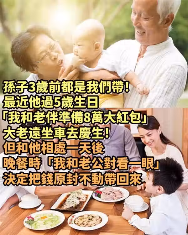 孫子3歲前都是我們帶!最近他過5歲的生日「我和老伴準備8萬大紅包」大老遠坐車去慶生!但和他相處一天後,晚餐時「我和老公對看一眼」決定把錢原封不動帶回來😔