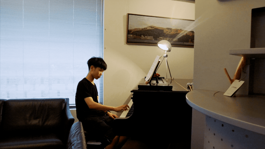 為了方便就讀音樂班的孩子們練習,Kevin在下樓梯的轉角處擺了古典鋼琴和木琴,其餘空間規劃了中島式廚房和餐廳。